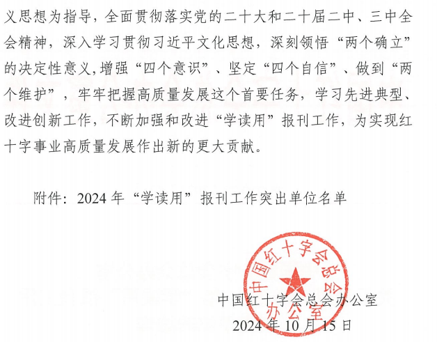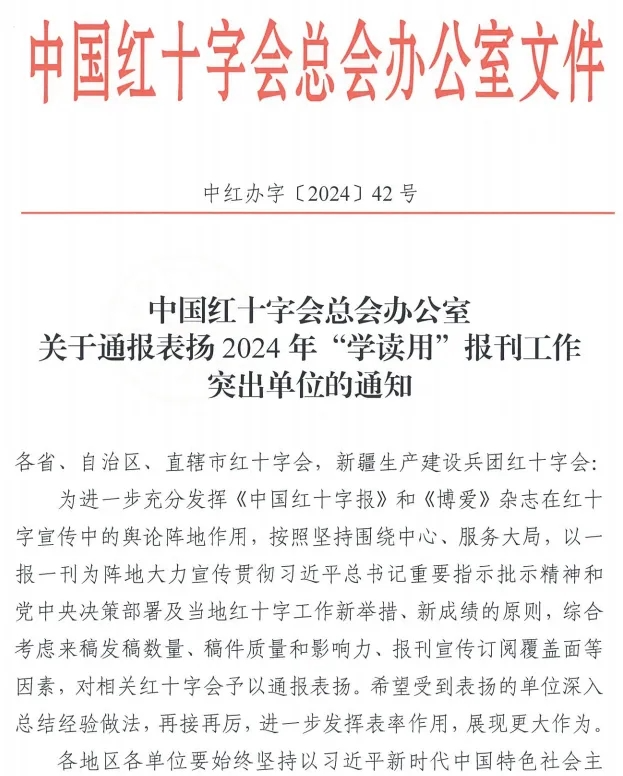 近日,中国红十字会总会办公室印发《关于通报表扬2024年“学读用”报刊工作突出单位的通知》,沾化区红十字会获通报表扬。