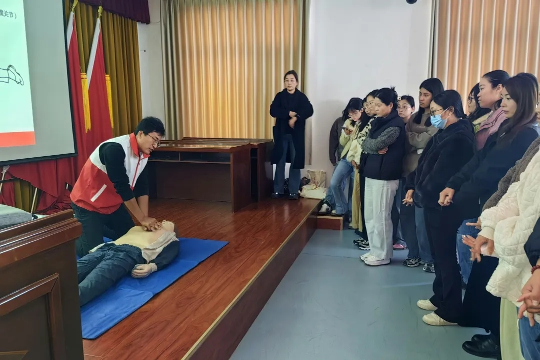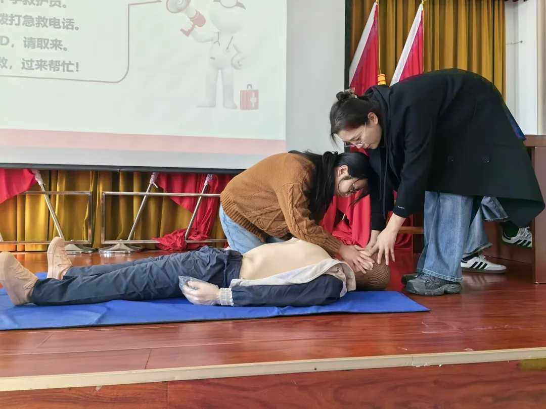 活动中,授课老师详细讲解应急救护基础知识,重点介绍心肺复苏操作流程及自动体外除颤器(AED)的使用原理,现场示范在“黄金抢救时间”内为伤者进行心肺复苏的正确步骤,并对异物窒息排出法等相关急救知识进行详细解读。